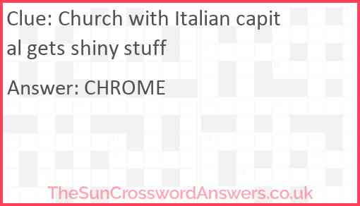 Church with Italian capital gets shiny stuff is a crossword clue for which we have 1 possible answer and we have spotted 1 times in our database. This crossword clue was last seen on 05 June 2019 in The Sun Cryptic Crossword puzzle!