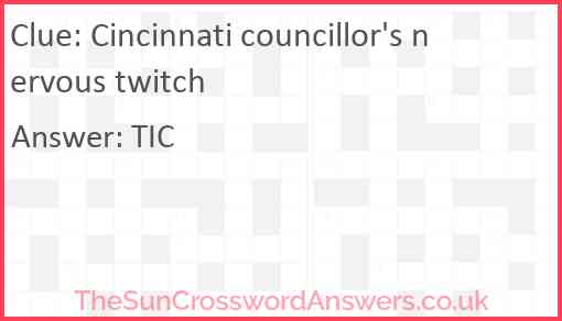 Cincinnati councillor's nervous twitch is a crossword clue for which we have 1 possible answer and we have spotted 1 times in our database. This crossword clue was last seen on 05 September 2021 in The Sun Cryptic Crossword puzzle!