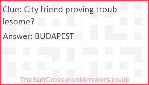 City friend proving troublesome? is a crossword clue for which we have 1 possible answer and we have spotted 2 times in our database. This crossword clue was last seen on 23 May 2023 in The Sun Cryptic Crossword puzzle!