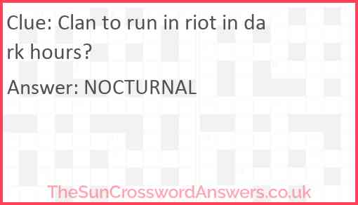 Clan to run in riot in dark hours? is a crossword clue for which we have 1 possible answer and we have spotted 1 times in our database. This crossword clue was last seen on 26 May 2021 in The Sun Cryptic Crossword puzzle!