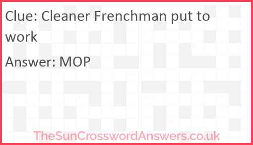 Cleaner Frenchman put to work is a crossword clue for which we have 1 possible answer and we have spotted 1 times in our database. This crossword clue was last seen on 21 December 2024 in The Sun Cryptic Crossword puzzle!