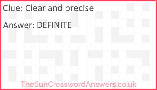 Clear and precise is a crossword clue for which we have 1 possible answer and we have spotted 5 times in our database. This crossword clue was last seen on 26 January 2025 in The Sun Coffee Time Crossword puzzle!