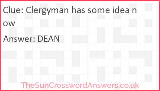 Clergyman has some idea now is a crossword clue for which we have 1 possible answer and we have spotted 3 times in our database. This crossword clue was last seen on 01 April 2024 in The Sun Cryptic Crossword puzzle!