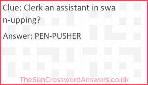 Clerk an assistant in swan-upping? is a crossword clue for which we have 2 possible answer and we have spotted 2 times in our database. This crossword clue was last seen on 14 April 2024 in The Sun Cryptic Crossword puzzle!