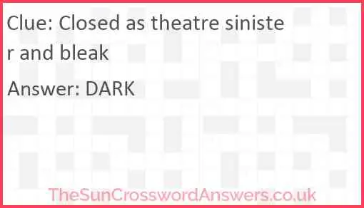 Closed as theatre sinister and bleak is a crossword clue for which we have 1 possible answer and we have spotted 1 times in our database. This crossword clue was last seen on 28 February 2025 in The Sun Cryptic Crossword puzzle!