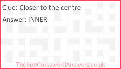 Closer to the centre is a crossword clue for which we have 1 possible answer and we have spotted 1 times in our database. This crossword clue was last seen on 25 June 2019 in The Sun Coffee Time Crossword puzzle!