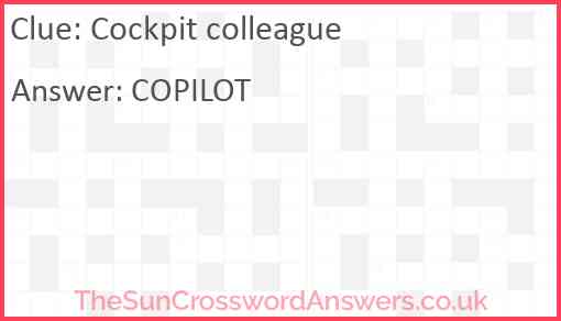Cockpit colleague is a crossword clue for which we have 1 possible answer and we have spotted 2 times in our database. This crossword clue was last seen on 30 January 2025 in The Sun Coffee Time Crossword puzzle!