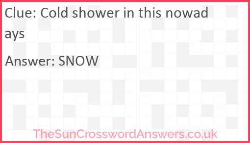Cold shower in this nowadays is a crossword clue for which we have 1 possible answer and we have spotted 1 times in our database. This crossword clue was last seen on 26 July 2021 in The Sun Cryptic Crossword puzzle!