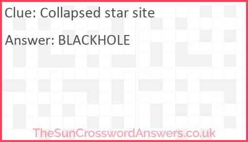 Collapsed star site is a crossword clue for which we have 1 possible answer and we have spotted 2 times in our database. This crossword clue was last seen on 13 November 2021 in The Sun Coffee Time Crossword puzzle!