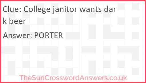 College janitor wants dark beer is a crossword clue for which we have 1 possible answer and we have spotted 2 times in our database. This crossword clue was last seen on 23 December 2023 in The Sun Cryptic Crossword puzzle!