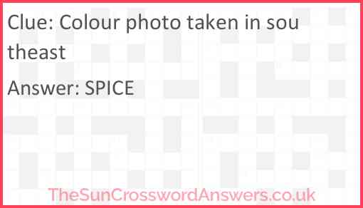 Colour photo taken in southeast is a crossword clue for which we have 1 possible answer and we have spotted 2 times in our database. This crossword clue was last seen on 20 March 2025 in The Sun Cryptic Crossword puzzle!