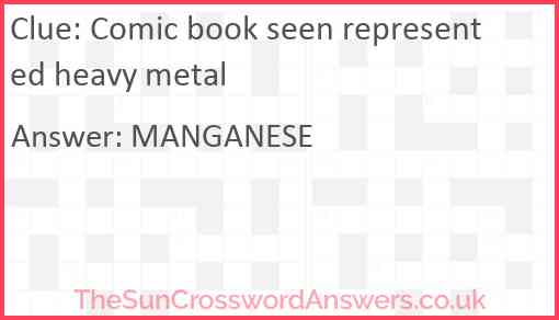 Comic book seen represented heavy metal is a crossword clue for which we have 1 possible answer and we have spotted 1 times in our database. This crossword clue was last seen on 19 July 2024 in The Sun Cryptic Crossword puzzle!