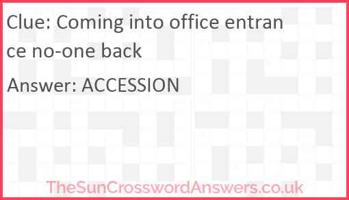 Coming into office entrance no-one back is a crossword clue for which we have 1 possible answer and we have spotted 2 times in our database. This crossword clue was last seen on 22 November 2024 in The Sun Cryptic Crossword puzzle!