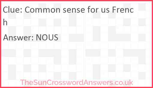 Common sense for us French is a crossword clue for which we have 1 possible answer and we have spotted 2 times in our database. This crossword clue was last seen on 18 April 2023 in The Sun Cryptic Crossword puzzle!