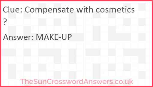 Compensate with cosmetics? is a crossword clue for which we have 2 possible answer and we have spotted 3 times in our database. This crossword clue was last seen on 19 September 2023 in The Sun Cryptic Crossword puzzle!