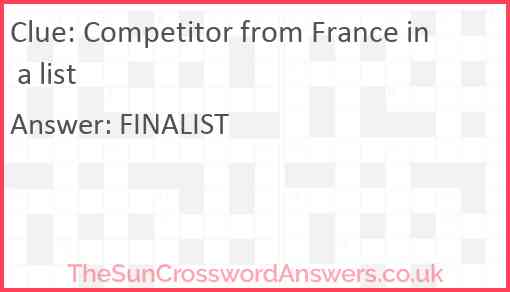 Competitor from France in a list is a crossword clue for which we have 1 possible answer and we have spotted 1 times in our database. This crossword clue was last seen on 10 August 2021 in The Sun Cryptic Crossword puzzle!