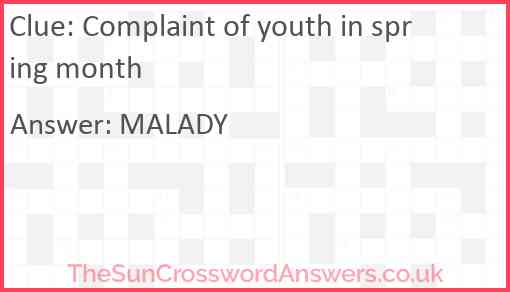 Complaint of youth in spring month is a crossword clue for which we have 1 possible answer and we have spotted 2 times in our database. This crossword clue was last seen on 27 November 2022 in The Sun Cryptic Crossword puzzle!