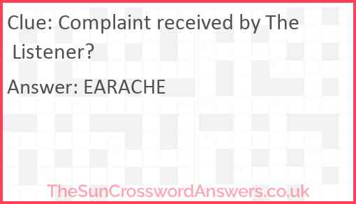 Complaint received by The Listener? is a crossword clue for which we have 1 possible answer and we have spotted 3 times in our database. This crossword clue was last seen on 17 March 2025 in The Sun Cryptic Crossword puzzle!