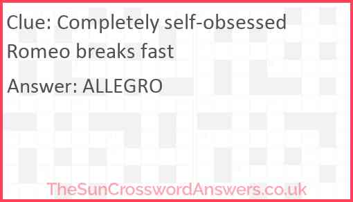 Completely self-obsessed Romeo breaks fast is a crossword clue for which we have 1 possible answer and we have spotted 2 times in our database. This crossword clue was last seen on 13 March 2025 in The Sun Cryptic Crossword puzzle!