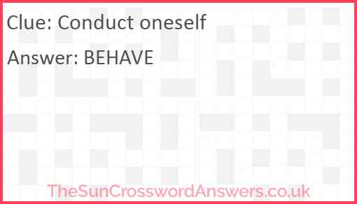 Conduct oneself is a crossword clue for which we have 1 possible answer and we have spotted 1 times in our database. This crossword clue was last seen on 03 November 2024 in The Sun Coffee Time Crossword puzzle!