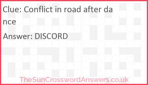 Conflict in road after dance is a crossword clue for which we have 1 possible answer and we have spotted 2 times in our database. This crossword clue was last seen on 11 September 2020 in The Sun Cryptic Crossword puzzle!