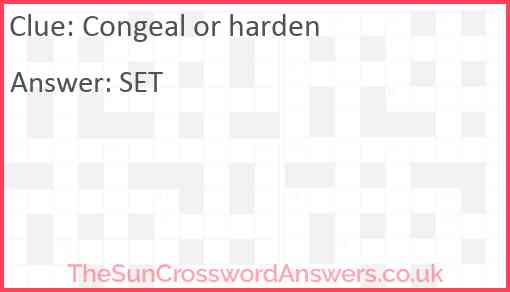Congeal or harden is a crossword clue for which we have 1 possible answer and we have spotted 2 times in our database. This crossword clue was last seen on 29 January 2022 in The Sun Coffee Time Crossword puzzle!