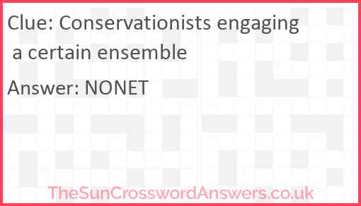 Conservationists engaging a certain ensemble is a crossword clue for which we have 1 possible answer and we have spotted 1 times in our database. This crossword clue was last seen on 01 August 2023 in The Sun Cryptic Crossword puzzle!