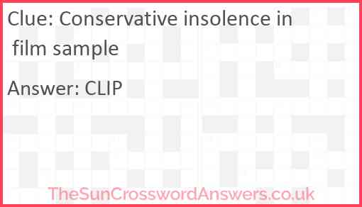 Conservative insolence in film sample is a crossword clue for which we have 1 possible answer and we have spotted 1 times in our database. This crossword clue was last seen on 14 April 2024 in The Sun Cryptic Crossword puzzle!