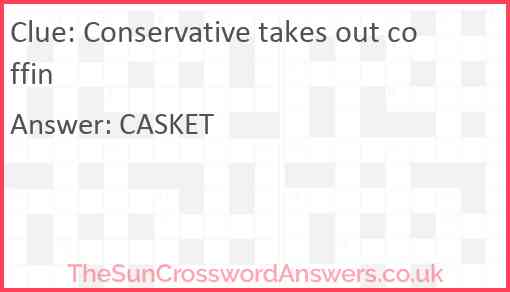 Conservative takes out coffin is a crossword clue for which we have 1 possible answer and we have spotted 1 times in our database. This crossword clue was last seen on 26 November 2024 in The Sun Cryptic Crossword puzzle!