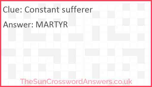 Constant sufferer is a crossword clue for which we have 1 possible answer and we have spotted 1 times in our database. This crossword clue was last seen on 08 October 2024 in The Sun Coffee Time Crossword puzzle!