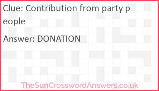 Contribution from party people is a crossword clue for which we have 1 possible answer and we have spotted 3 times in our database. This crossword clue was last seen on 26 November 2024 in The Sun Cryptic Crossword puzzle!