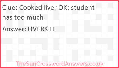 Cooked liver OK: student has too much is a crossword clue for which we have 1 possible answer and we have spotted 1 times in our database. This crossword clue was last seen on 13 December 2022 in The Sun Cryptic Crossword puzzle!