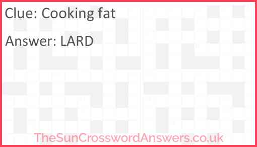 Cooking fat is a crossword clue for which we have 1 possible answer and we have spotted 1 times in our database. This crossword clue was last seen on 03 October 2018 in The Sun Coffee Time Crossword puzzle!