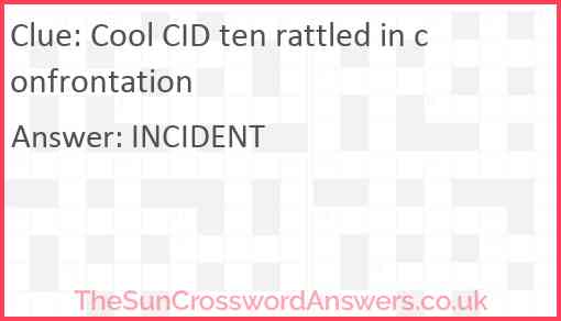 Cool CID ten rattled in confrontation is a crossword clue for which we have 1 possible answer and we have spotted 3 times in our database. This crossword clue was last seen on 25 April 2023 in The Sun Cryptic Crossword puzzle!