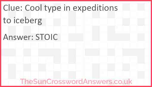 Cool type in expeditions to iceberg is a crossword clue for which we have 1 possible answer and we have spotted 3 times in our database. This crossword clue was last seen on 29 October 2024 in The Sun Cryptic Crossword puzzle!