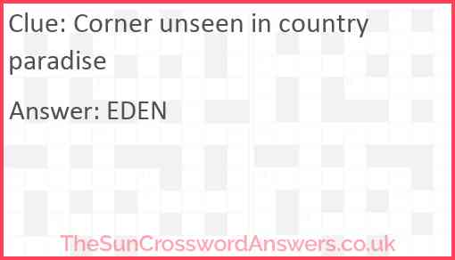 Corner unseen in country paradise is a crossword clue for which we have 1 possible answer and we have spotted 1 times in our database. This crossword clue was last seen on 19 June 2024 in The Sun Cryptic Crossword puzzle!