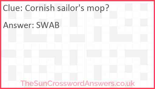 Cornish sailor's mop? is a crossword clue for which we have 1 possible answer and we have spotted 2 times in our database. This crossword clue was last seen on 20 July 2025 in The Sun Cryptic Crossword puzzle!