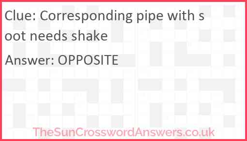 Corresponding pipe with soot needs shake is a crossword clue for which we have 1 possible answer and we have spotted 2 times in our database. This crossword clue was last seen on 16 May 2023 in The Sun Cryptic Crossword puzzle!