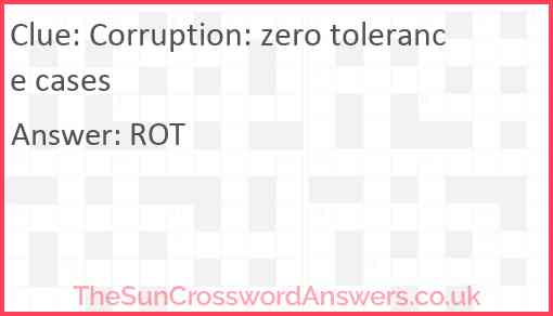 Corruption: zero tolerance cases is a crossword clue for which we have 1 possible answer and we have spotted 2 times in our database. This crossword clue was last seen on 05 November 2023 in The Sun Cryptic Crossword puzzle!