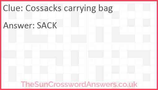 Cossacks carrying bag is a crossword clue for which we have 1 possible answer and we have spotted 2 times in our database. This crossword clue was last seen on 27 January 2023 in The Sun Cryptic Crossword puzzle!