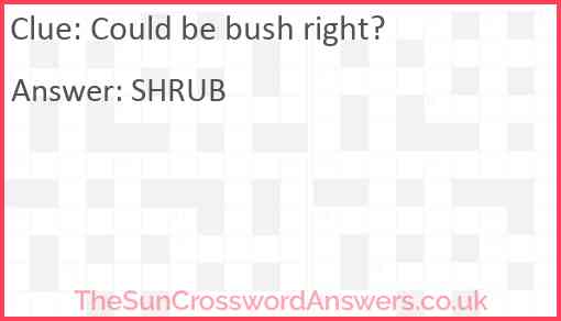 Could be bush right? is a crossword clue for which we have 1 possible answer and we have spotted 1 times in our database. This crossword clue was last seen on 30 January 2025 in The Sun Cryptic Crossword puzzle!