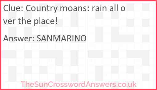 Country moans: rain all over the place! is a crossword clue for which we have 1 possible answer and we have spotted 1 times in our database. This crossword clue was last seen on 09 September 2023 in The Sun Cryptic Crossword puzzle!