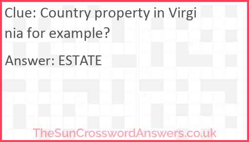 Country property in Virginia for example? is a crossword clue for which we have 1 possible answer and we have spotted 2 times in our database. This crossword clue was last seen on 25 March 2025 in The Sun Cryptic Crossword puzzle!