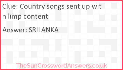 Country songs sent up with limp content is a crossword clue for which we have 1 possible answer and we have spotted 1 times in our database. This crossword clue was last seen on 21 May 2021 in The Sun Cryptic Crossword puzzle!