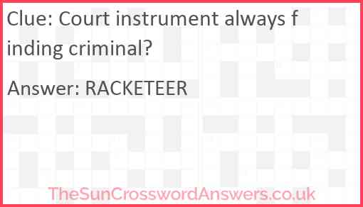 Court instrument always finding criminal? is a crossword clue for which we have 1 possible answer and we have spotted 2 times in our database. This crossword clue was last seen on 16 July 2020 in The Sun Cryptic Crossword puzzle!