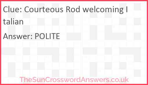 Courteous Rod welcoming Italian is a crossword clue for which we have 1 possible answer and we have spotted 4 times in our database. This crossword clue was last seen on 05 March 2025 in The Sun Cryptic Crossword puzzle!