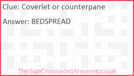 Coverlet or counterpane is a crossword clue for which we have 1 possible answer and we have spotted 2 times in our database. This crossword clue was last seen on 28 September 2023 in The Sun Coffee Time Crossword puzzle!