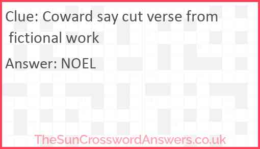 Coward say cut verse from fictional work is a crossword clue for which we have 1 possible answer and we have spotted 2 times in our database. This crossword clue was last seen on 22 October 2022 in The Sun Cryptic Crossword puzzle!