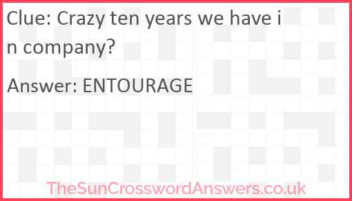 Crazy ten years we have in company? is a crossword clue for which we have 1 possible answer and we have spotted 2 times in our database. This crossword clue was last seen on 10 February 2022 in The Sun Cryptic Crossword puzzle!
