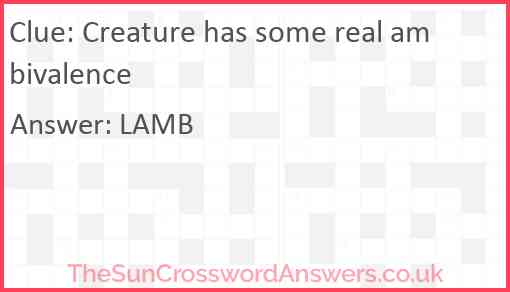 Creature has some real ambivalence is a crossword clue for which we have 1 possible answer and we have spotted 1 times in our database. This crossword clue was last seen on 16 August 2023 in The Sun Cryptic Crossword puzzle!